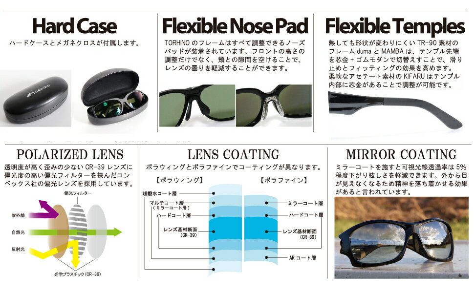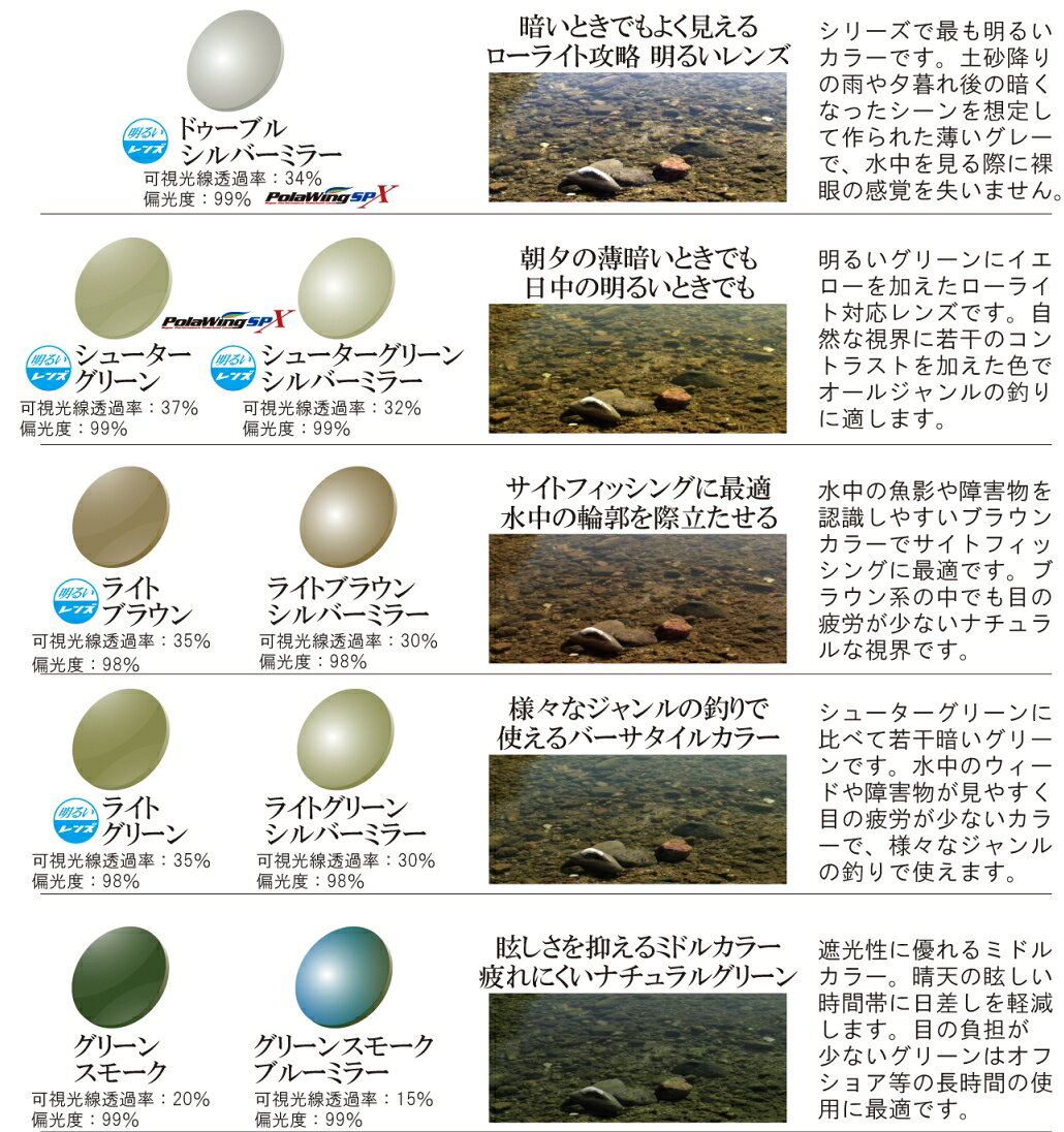 トライノはジャパンフィットのオリジナルフレームと透明度の高いCR-39で、朝夕や曇りのローライトコンディションでも明るい視界を作り出し、より多くの、より大きなターゲットを釣ることをコンセプトとしています。