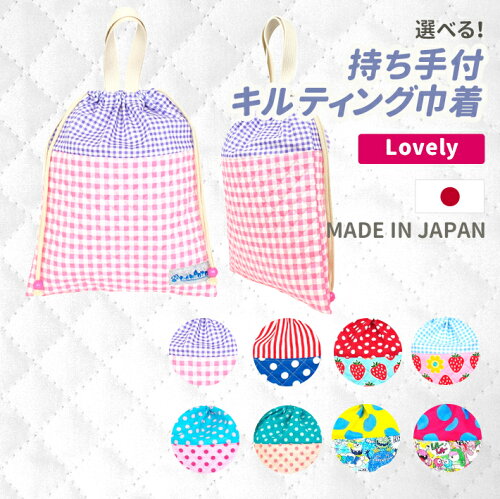 選べる!持ち手付キルティング巾着(大)ラブリー柄 女の子 男の子 ハンドメイド namioto 日本製 キッズバッグ 大きめ キルト巾着 丈夫 巾着 かばん お着替え入れ 弁当箱 巾着袋 保育園 幼稚園 入園 入学 ピンク チェック シンプル 人気 持ちやすい